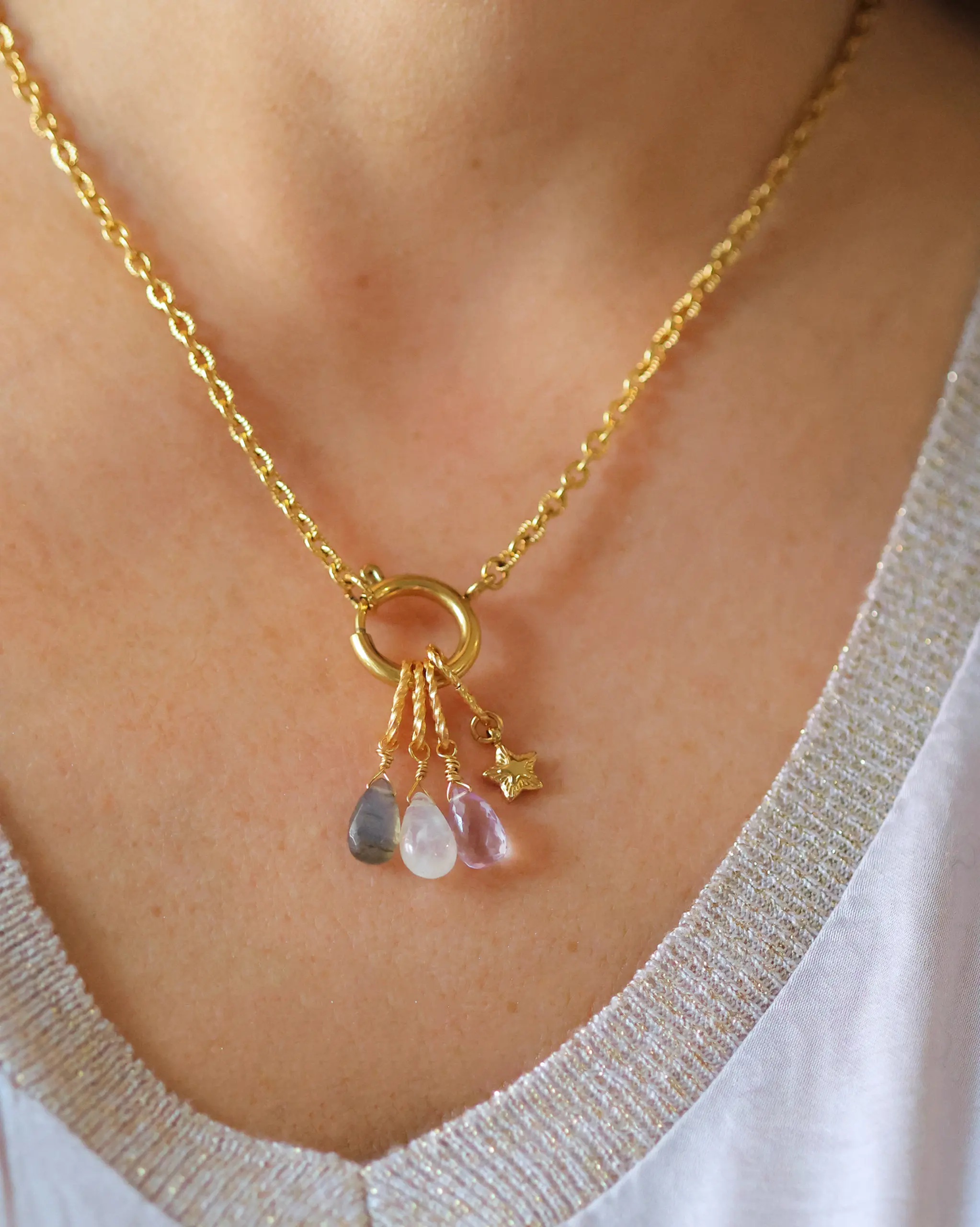 Collana e orecchini in acciaio inossidabile placcato oro 18k. Disponibili anche nella versione con finitura argentata. Charms: Gocce sfaccettate di: Ametista di circa 10×7 mm, Labradorite di circa 11×6 mm, Labradorite bianca di circa 11×6 mm, stellina di 9mm. Dimensioni: lunghezza collana 45 cm, diametro orecchini oro 17 mm, diametro orecchini argento 14mm. Nickel free.