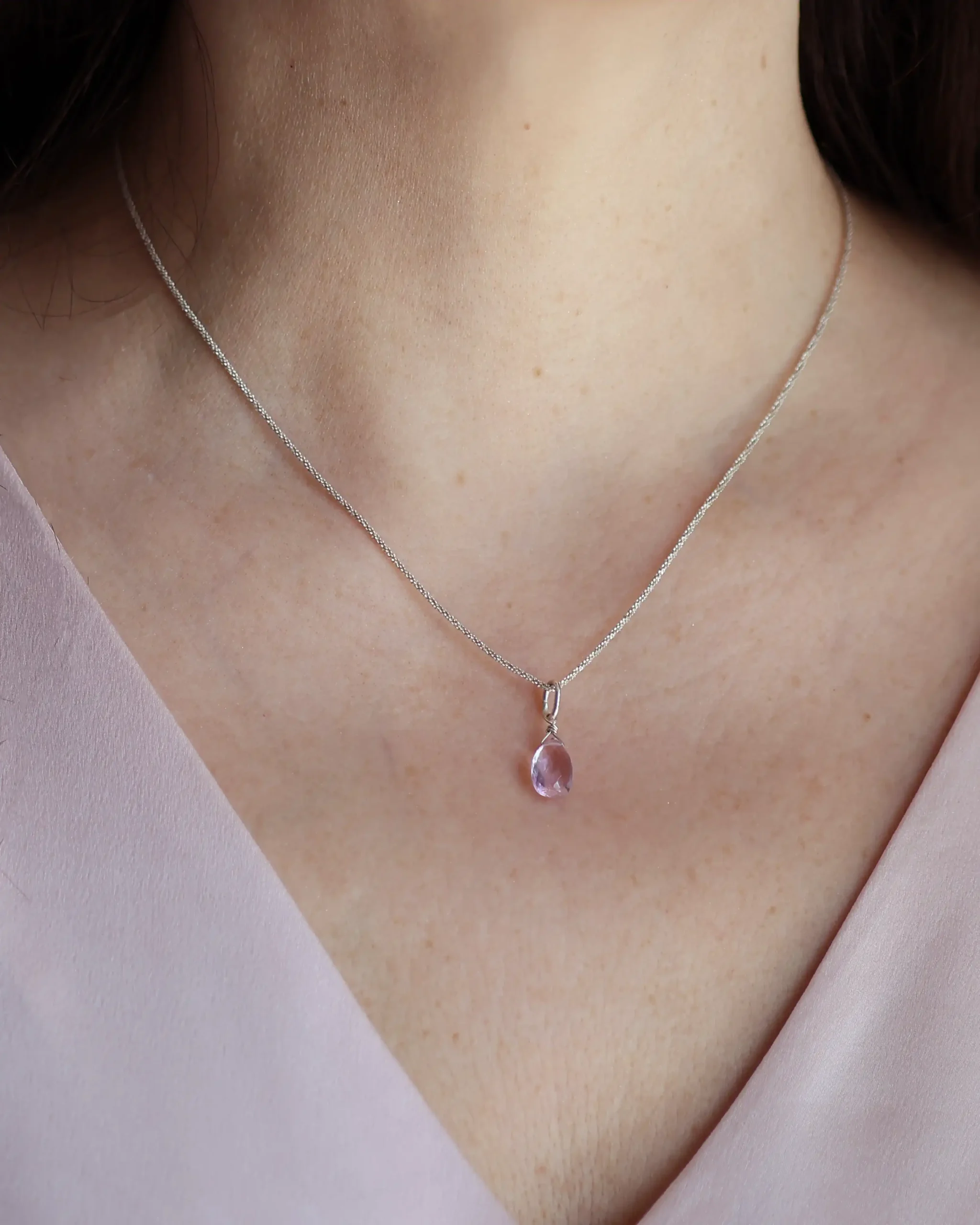Materiali: collana in argento 925. Pietre: ametista rosa di Francia sfaccettata dal colore lilla molto delicato taglio goccia di circa 11x6mm. Lunghezza: 40 cm + 3 cm di allungo. Nickel free.