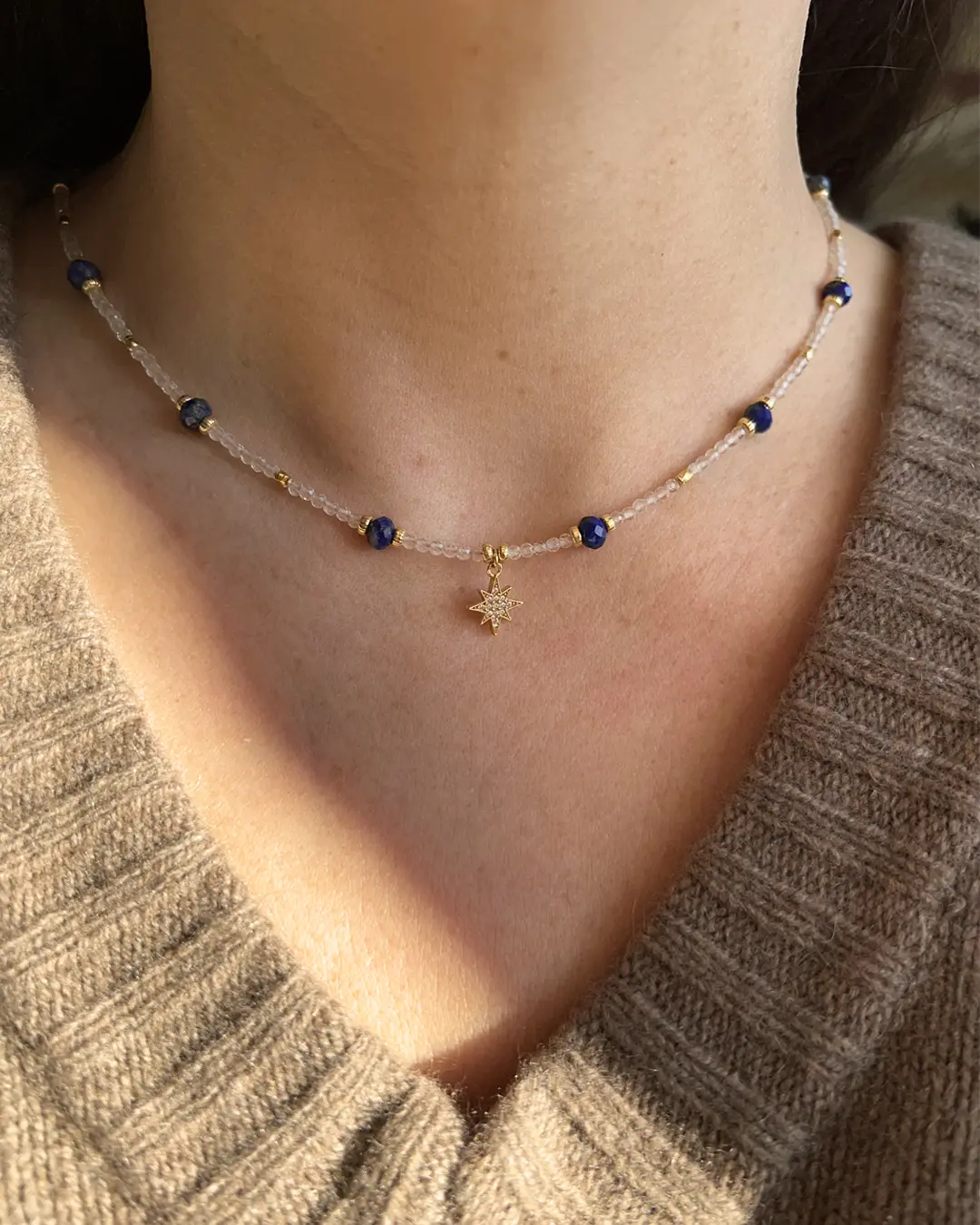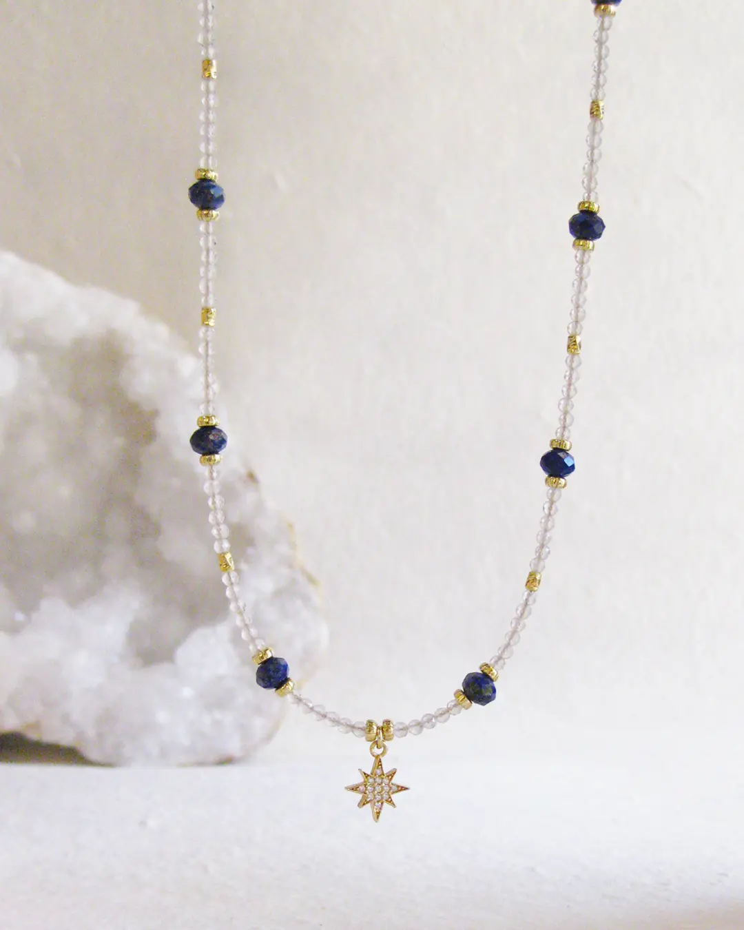 La Collana Stella del Nord è elegante e ricca di fascino: le trasparenze luminose del quarzo ialino si intrecciano al blu profondo del lapislazzuli, ricordando un cielo stellato.