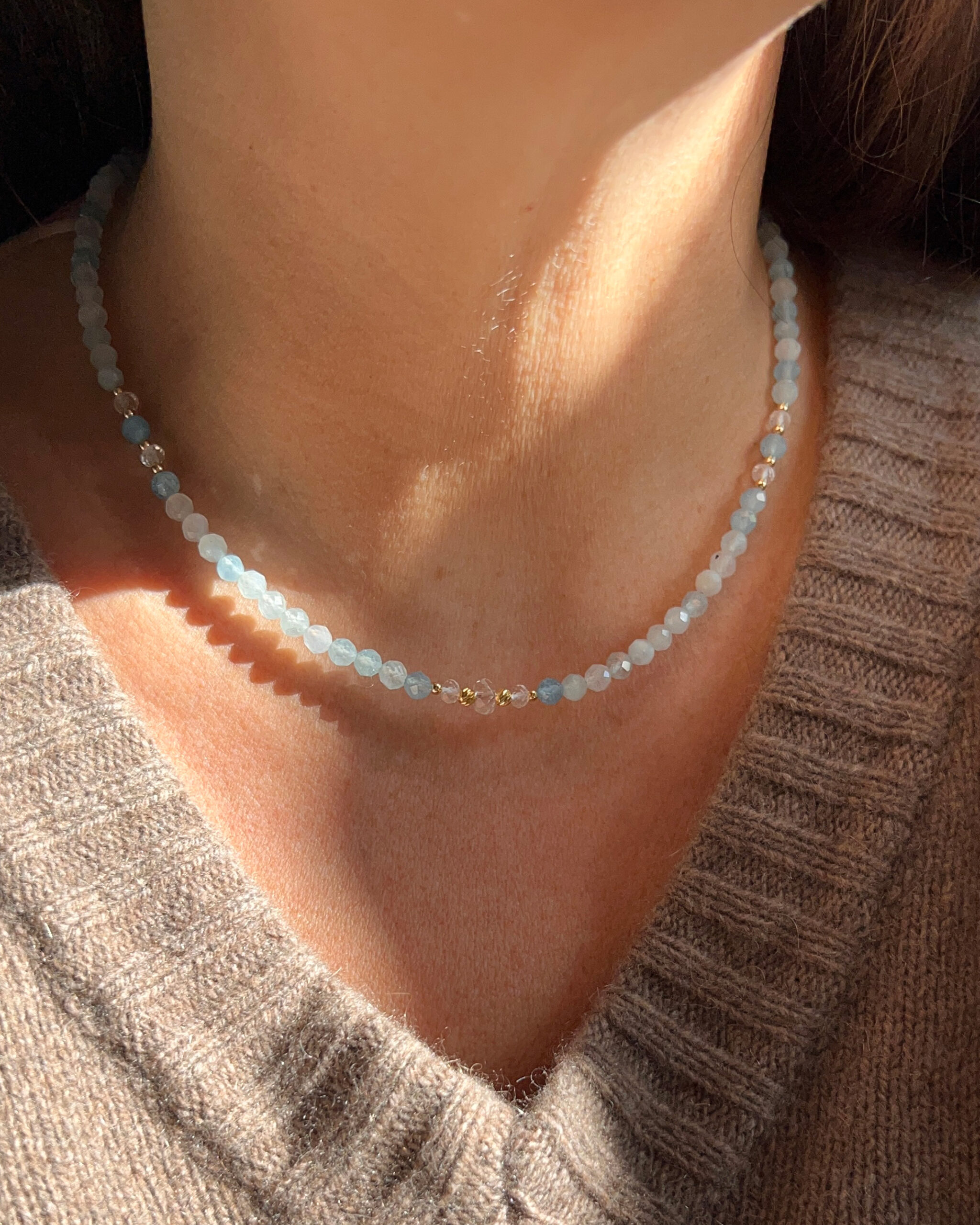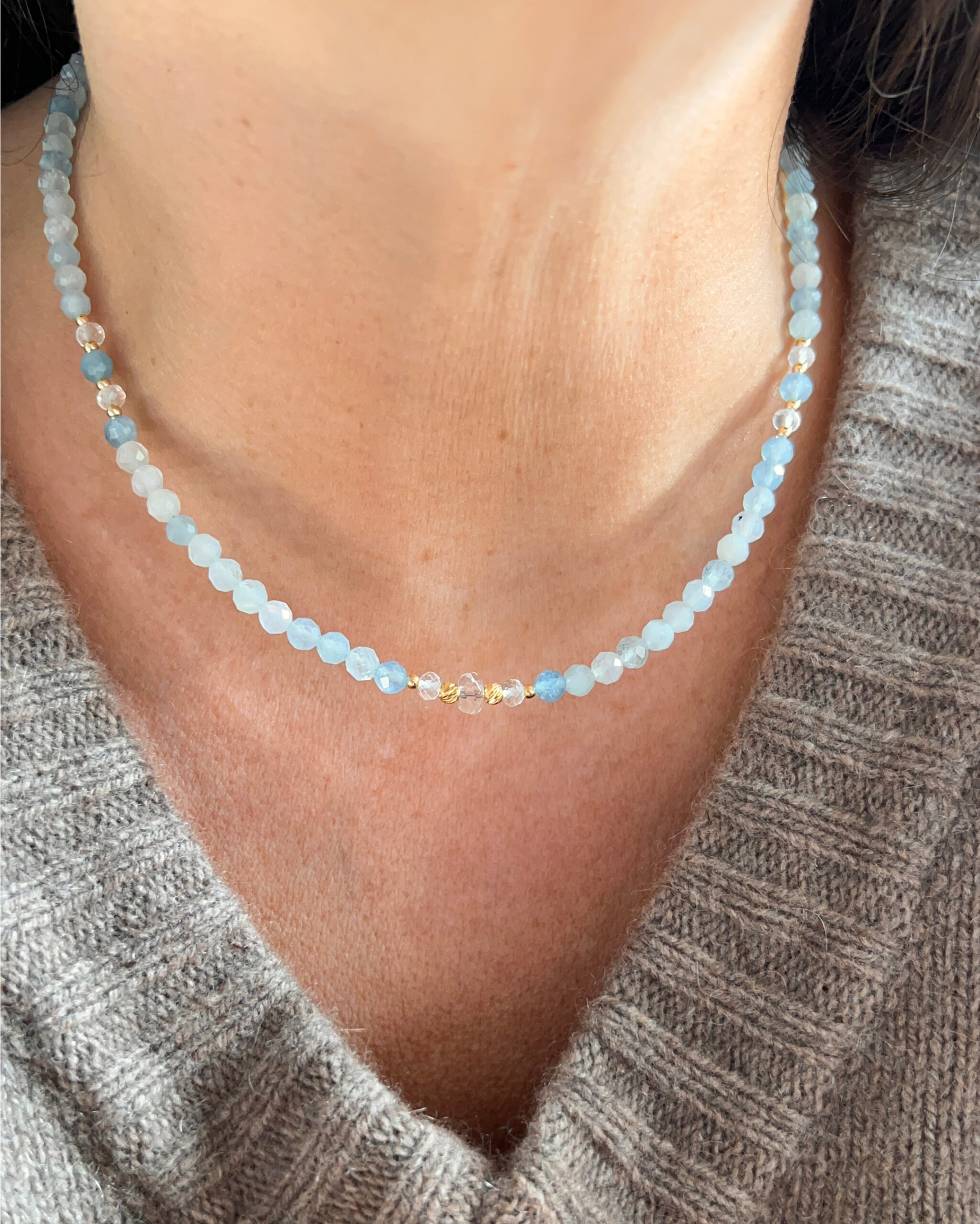 Questo girocollo è realizzato con pietre naturali accuratamente selezionate di Acquamarina dalle delicate tonalità di azzurro e 7 rondelle di Quarzo ialino disposte in modo simmetrico, con 3 punti luce centrali che creano un effetto elegante e raffinato.