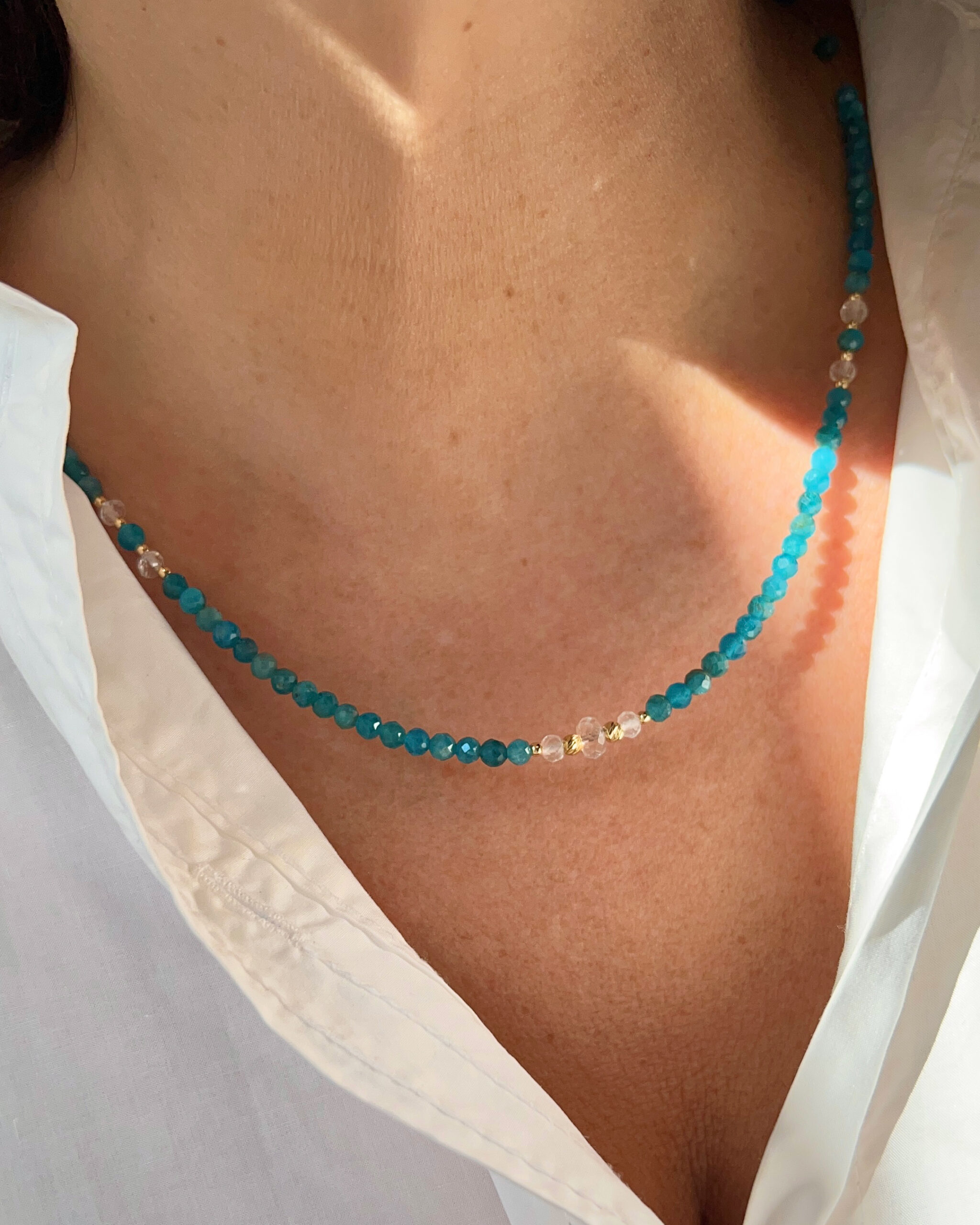 Girocollo con perline e chiusura in Argento 925 italiano e galvanica in oro 18k ad alta resistenza. Disponibile anche nella versione con finitura in Argento bianco. Pietre: sfaccettate di Apatite di circa 3 mm e rondelle di Quarzo ialino. Lunghezza: 36 cm + 3 cm di allungo. (È la misura standard del girocollo). Disponibile anche in altre lunghezze, selezionabili dal menu a tendina. Nickel free.