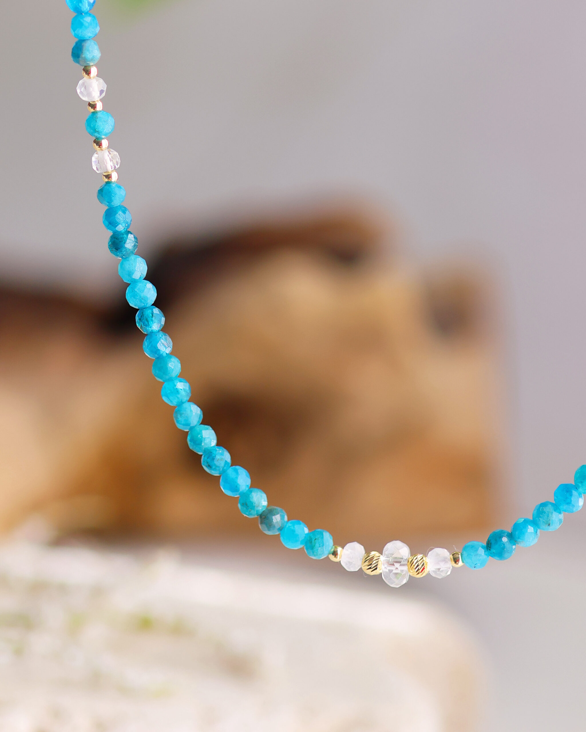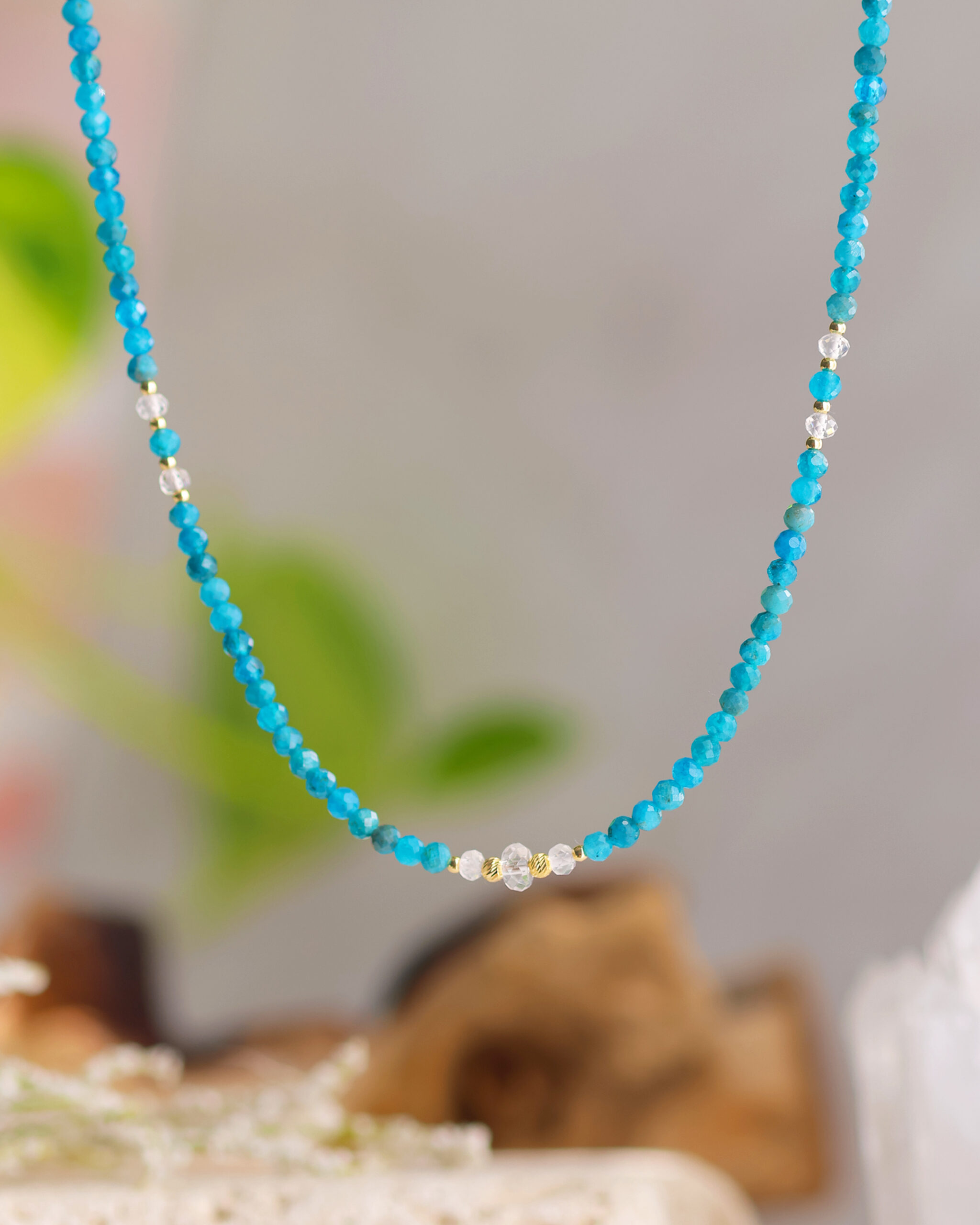 Questo girocollo è realizzato con pietre naturali accuratamente selezionate di Apatite dal colore blu vibrante e 7 rondelle di Quarzo ialino disposte in modo simmetrico, con 3 punti luce centrali che creano un effetto elegante e raffinato.