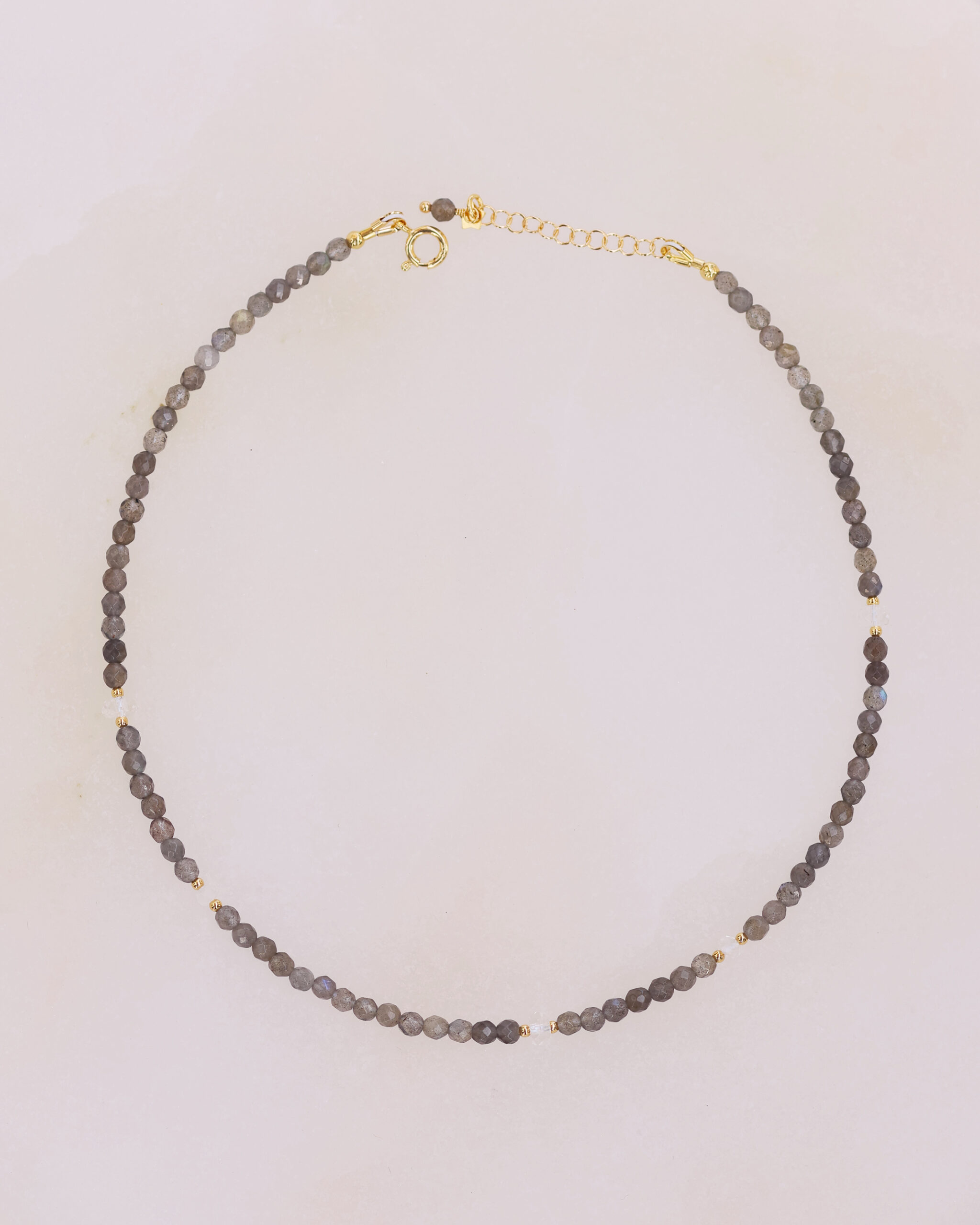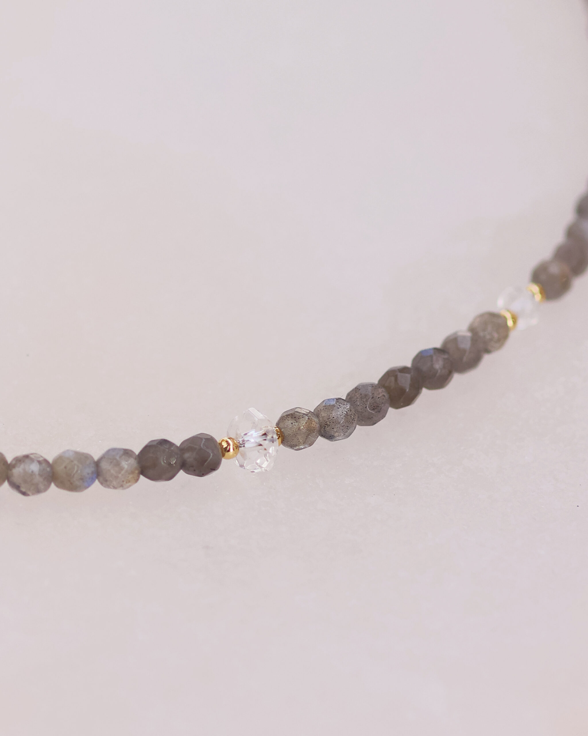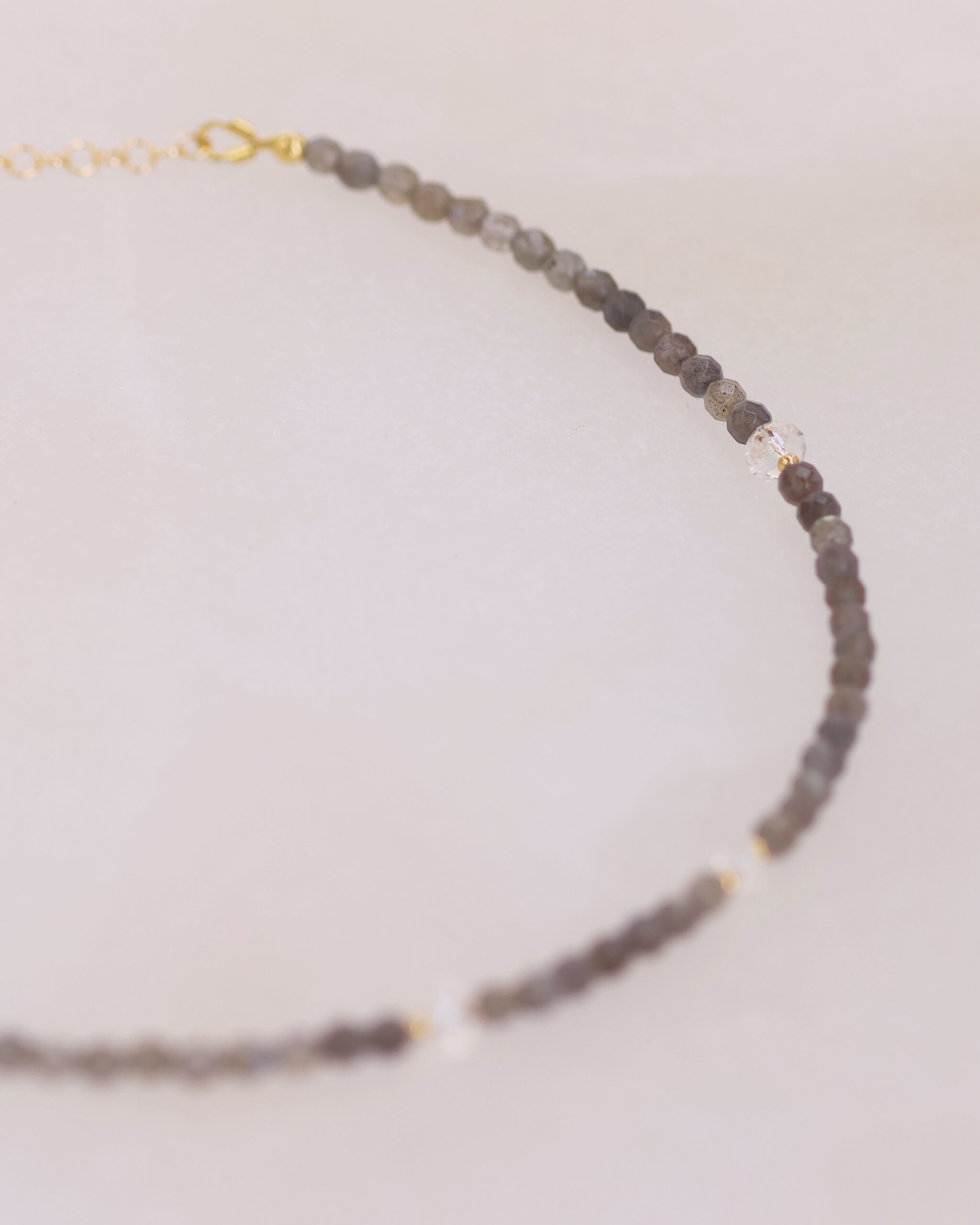 Questo girocollo è realizzato con pietre naturali accuratamente selezionate di Labradorite grigia e 5 rondelle di Quarzo ialino di diversa grandezza, distribuite lungo tutto il filo di pietre in modo asimmetrico, per un effetto armonioso e dinamico.