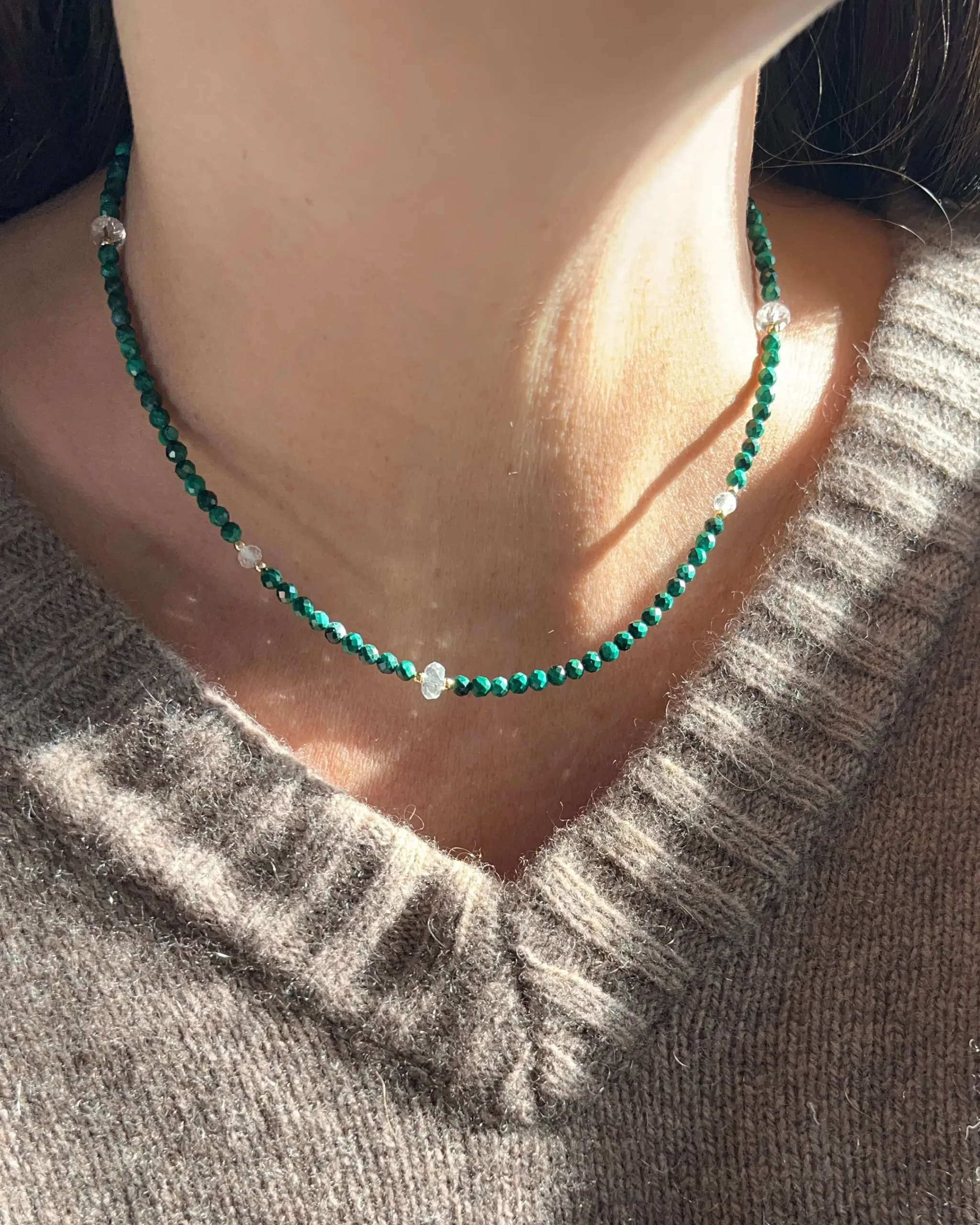 Questo girocollo è realizzato con pietre naturali accuratamente selezionate di Malachite dal verde intenso e 5 rondelle di Quarzo ialino di diversa grandezza, distribuite lungo tutto il filo di pietre in modo asimmetrico, per un effetto armonioso e dinamico.