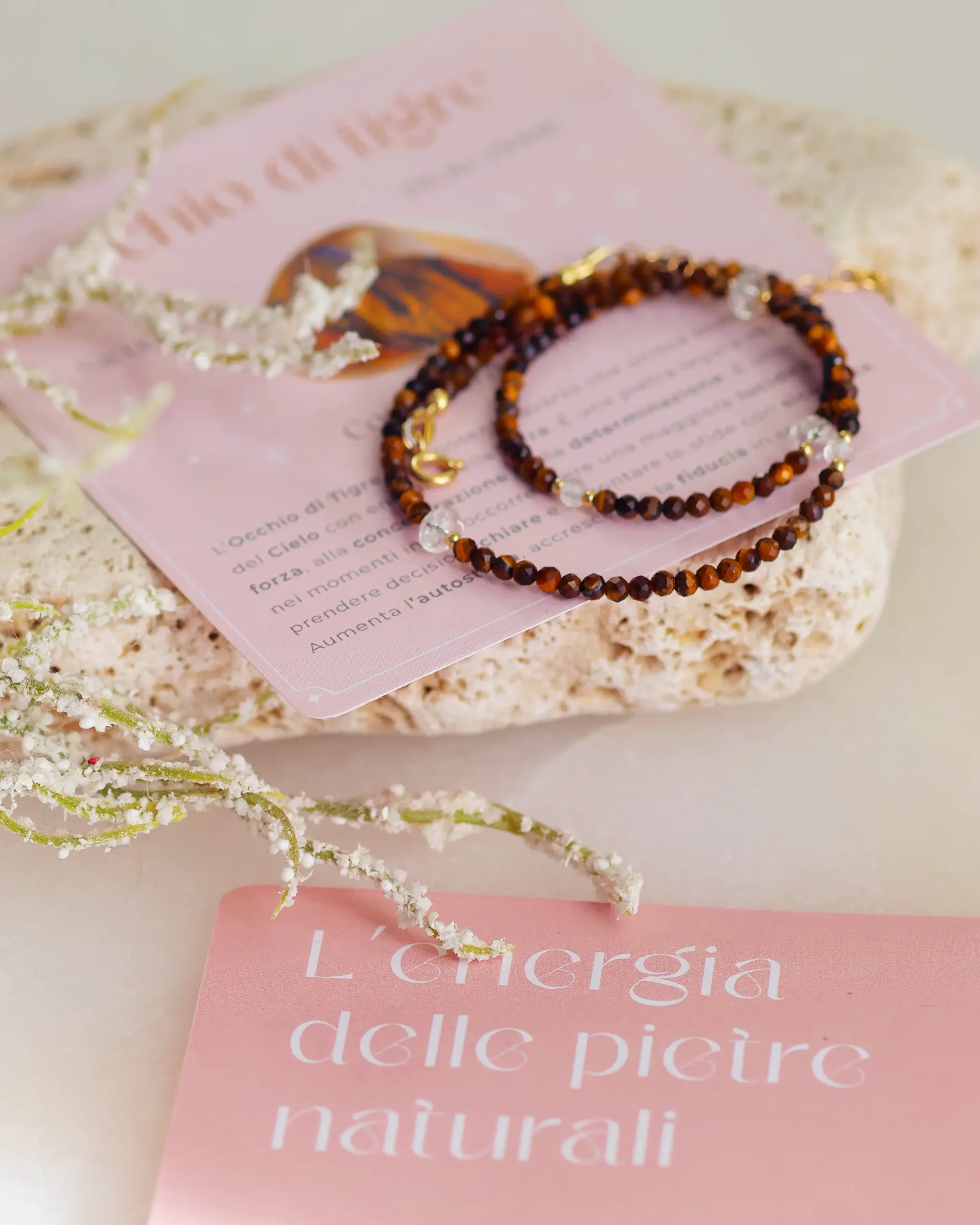 Il Quarzo ialino potenzia e valorizza l’energia dell’Occhio di tigre.