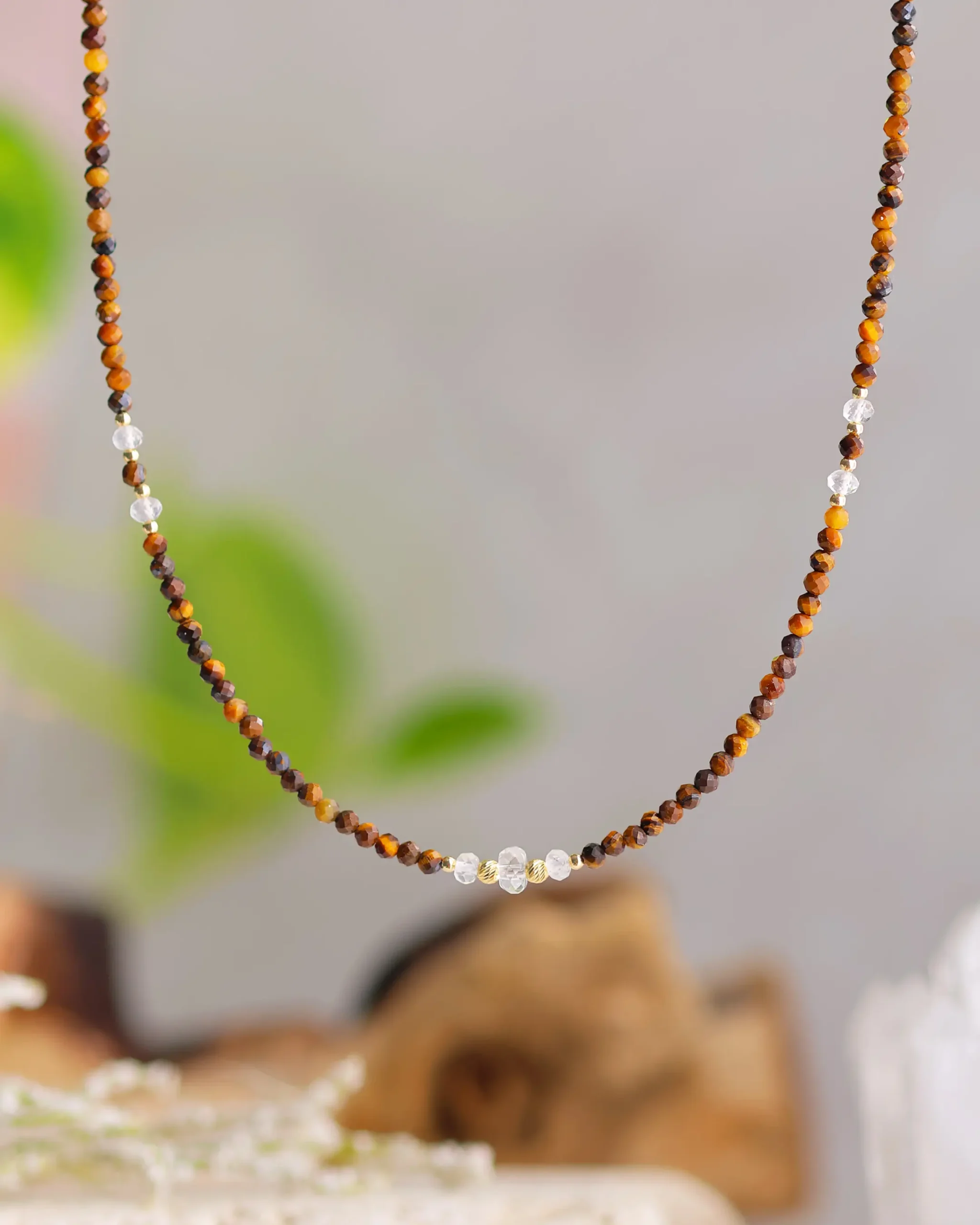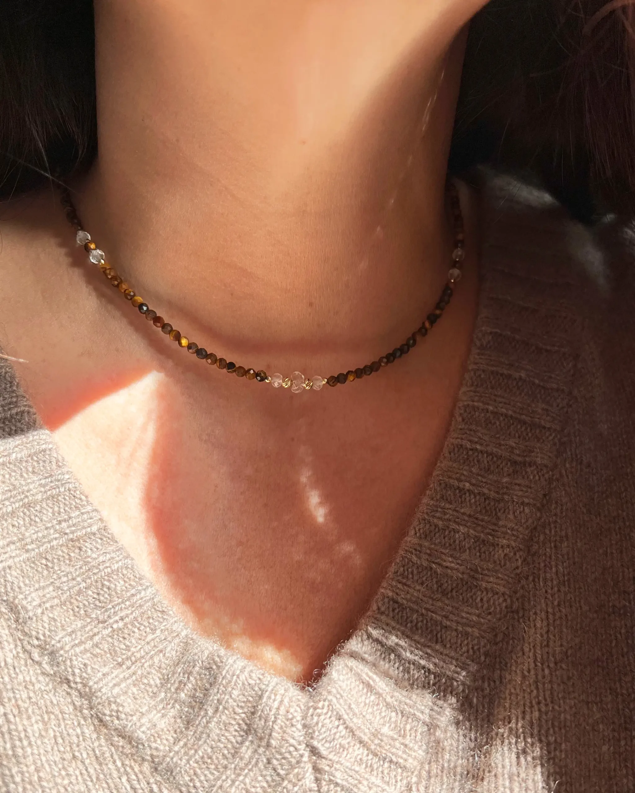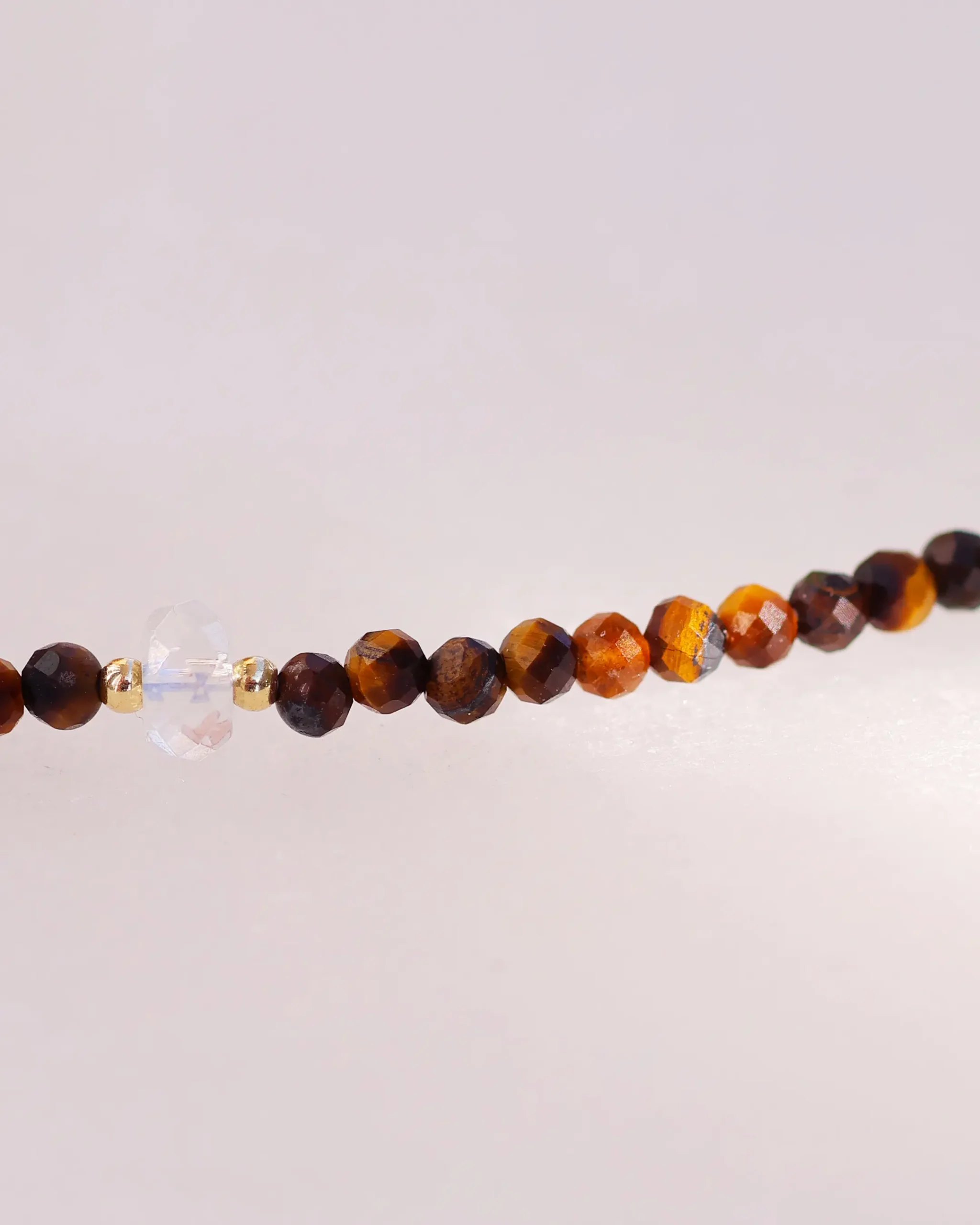 Questo girocollo è realizzato con pietre naturali accuratamente selezionate di Occhio di tigre dai toni dorati e bruni e 7 rondelle di Quarzo ialino disposte in modo simmetrico, con tre punti luce centrali che creano un effetto elegante e raffinato.