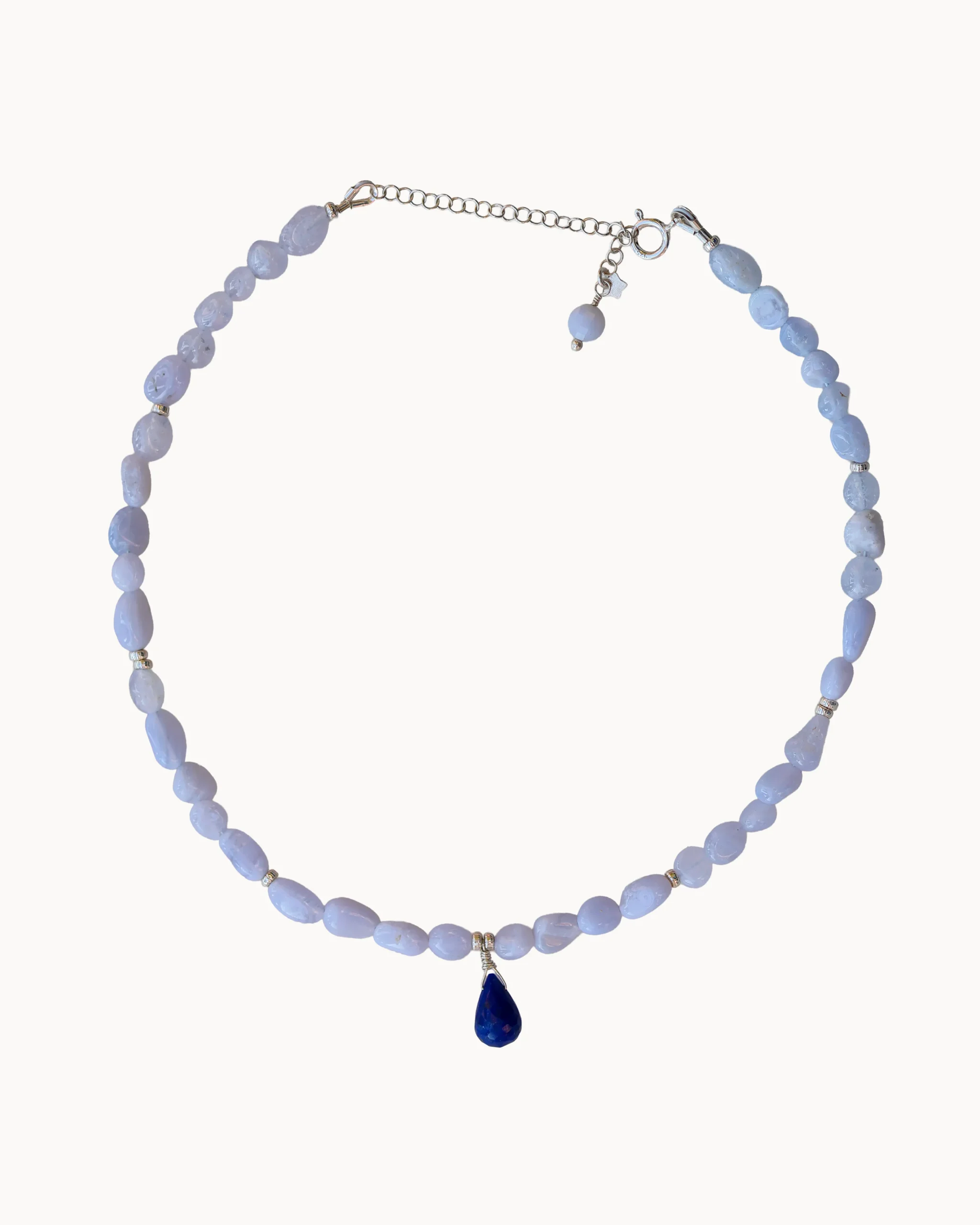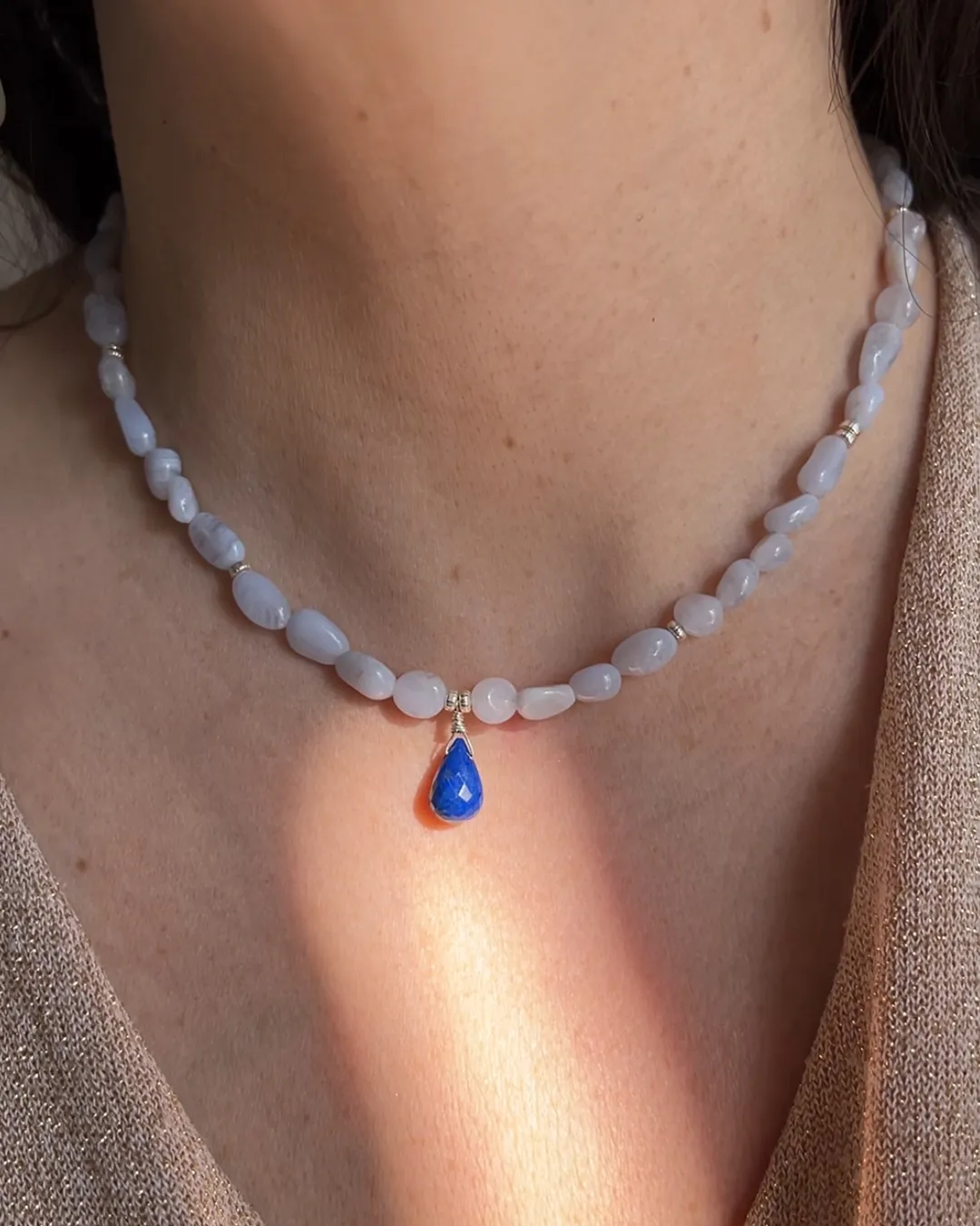 Girocollo realizzato con sassolini di Calcedonio naturale, dal caratteristico colore blu polveroso, abbinati a una briolette centrale di Lapislazzuli.